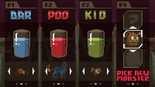 The bottom one is what we finally decided on for the monster upgrade screen- replacing putting blocks into a bar with squirting liquid all over monsters seems like a lot more fun 🙂