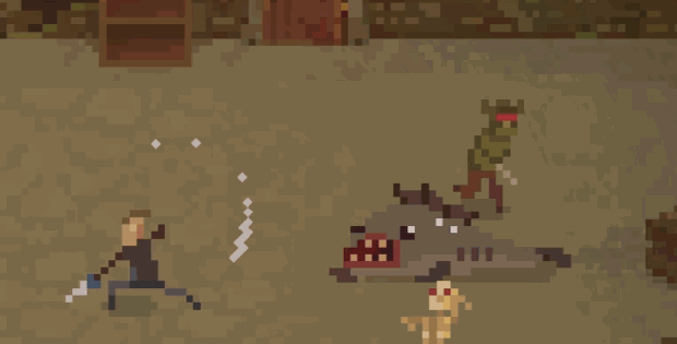 Here is an example of one of the magic types you can get with our randomly generated weapons- this is the “bloodstrike magic”. I’ve been tweeting lots of gifs, but this one got a lot more attention than any of the others, so I’m making a big note in my design book- “make shitloads more weapon magic!”
